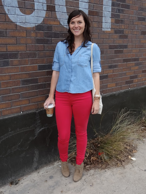 I picked this one up from Anthropologie on my trip to visit my sis in Houston. It was one of those crazy moments when you have to have exactly what the shop girl is wearing. I already had the red jeans, but the shirt was just what I was looking for in a new chambray shirt. My favorite part has to be the split shirt tail. It's kind of whispy and fun.